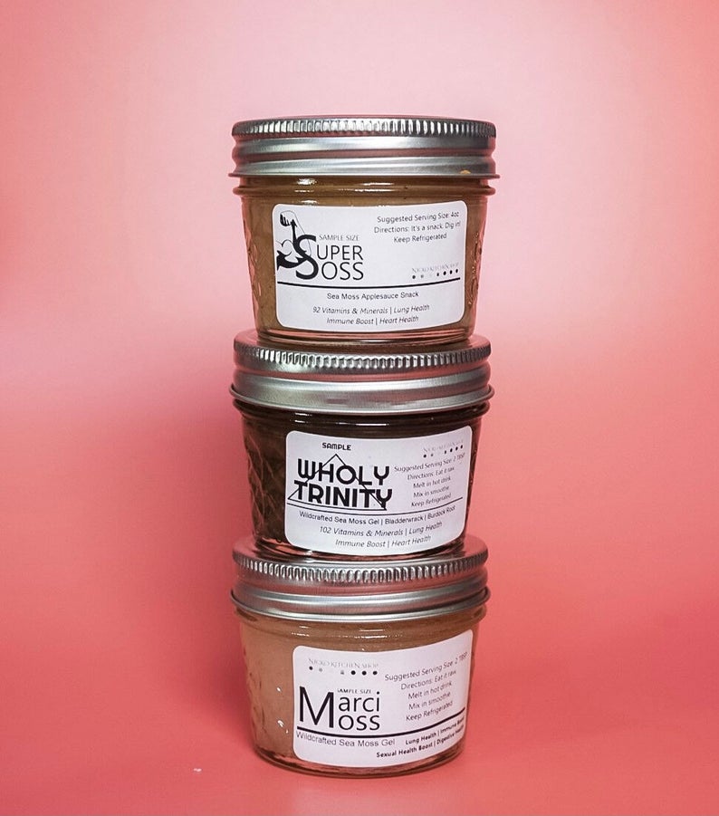 MarciMoss (4oz): A pure, raw, and creamy sea moss gel boasting 92 essential vitamins and minerals. Known for respiratory and immune support.
